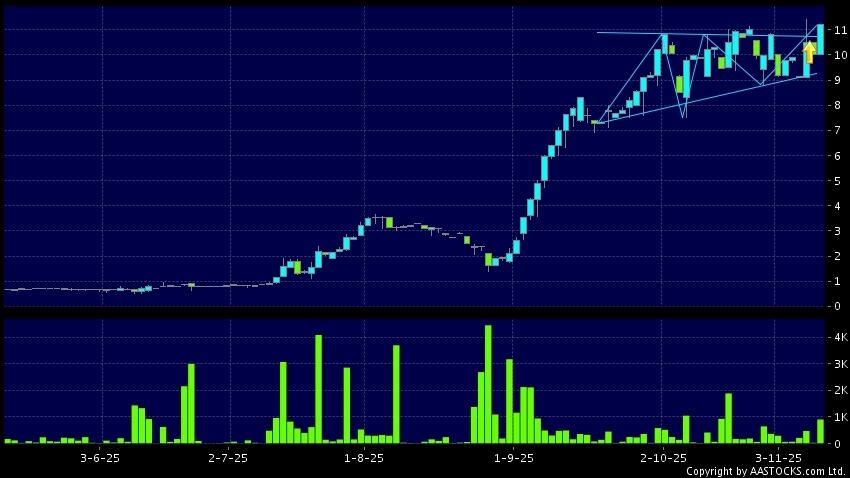 首都金融控股(08239.HK) +0.030 (+0.281%) 呈現三角形向上突破。現價報11.190,上升11.677%,成交量90.33萬股,成交額9.89百萬。