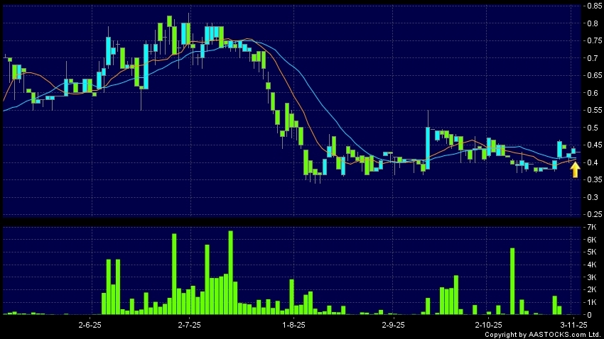 智城發展控股(08268.HK) -0.015 (-3.409%) 10天移動平均線升穿20天移動平均線,出現黃金交叉。現價報0.430,下跌2.273%,成交量8.00千股,成交額3.44千。