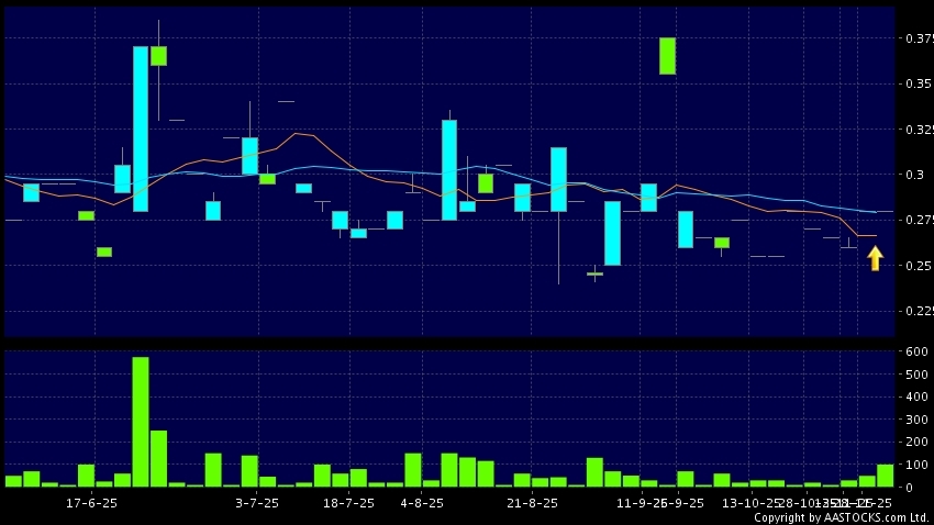 中國煤層氣(08270.HK) -0.025 (-7.937%) 10天移動平均線升穿20天移動平均線,出現黃金交叉。現價報0.280,無升跌,成交量10.00萬股,成交額2.80萬。