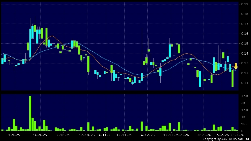 高原之寶(08402.HK) -0.018 (-14.063%) 10天移動平均線跌穿20天移動平均線,出現死亡交叉。現價報0.106,無升跌,成交量5.50萬股,成交額5.83千。