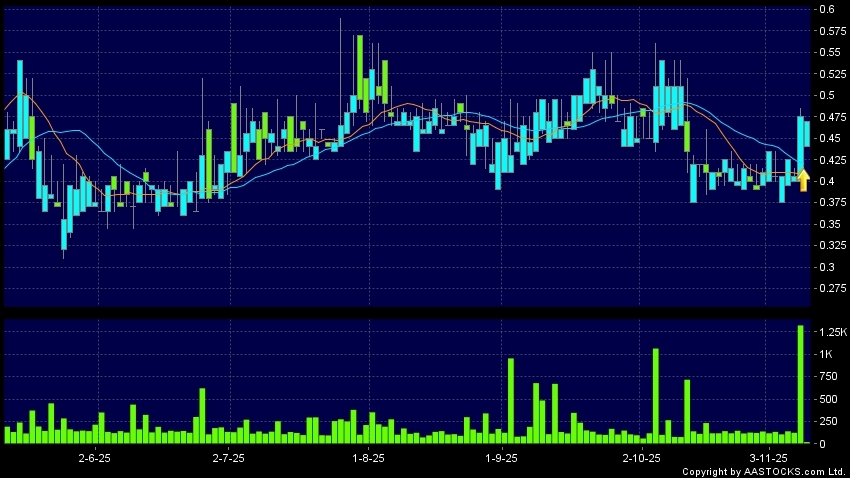 傲迪瑪汽車(08418.HK) -0.010 (-2.198%) 10天移動平均線升穿20天移動平均線,出現黃金交叉。現價報0.440,下跌7.368%,成交量1.00萬股,成交額4.40千。