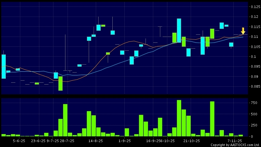 WT集團(08422.HK) 0.000 (0.000%) 10天移動平均線跌穿20天移動平均線,出現死亡交叉。現價報0.111,無升跌,成交量0.00股,成交額0.00。