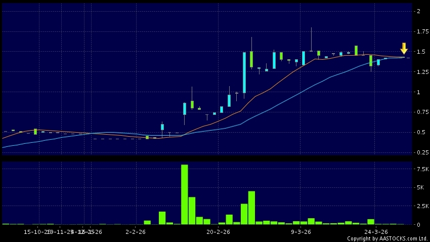 環球印館(08448.HK) +0.010 (+0.746%) 10天移動平均線跌穿20天移動平均線,出現死亡交叉。現價報1.420,無升跌,成交量2.32萬股,成交額3.28萬。