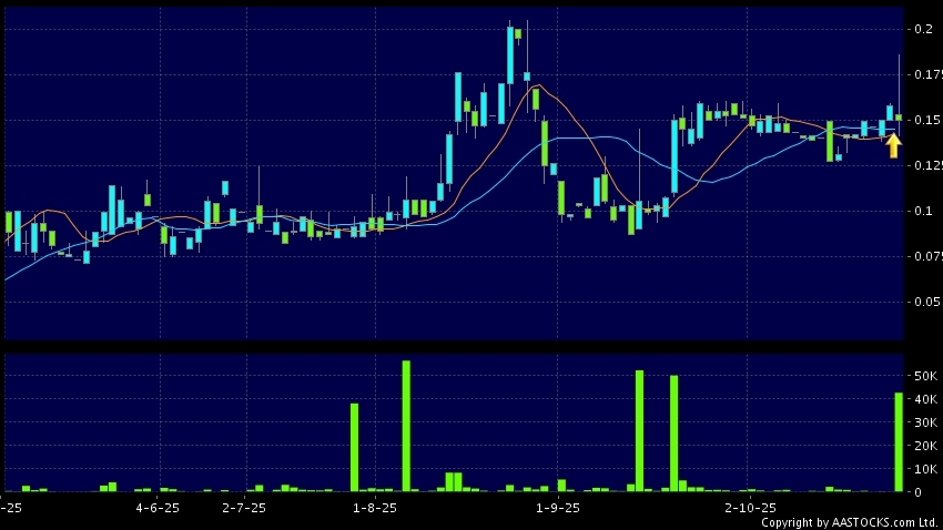 熒德控股(08535.HK) -0.009 (-7.317%) 10天移動平均線升穿20天移動平均線,出現黃金交叉。現價報0.150,下跌5.063%,成交量4.26千萬股,成交額7.15百萬。