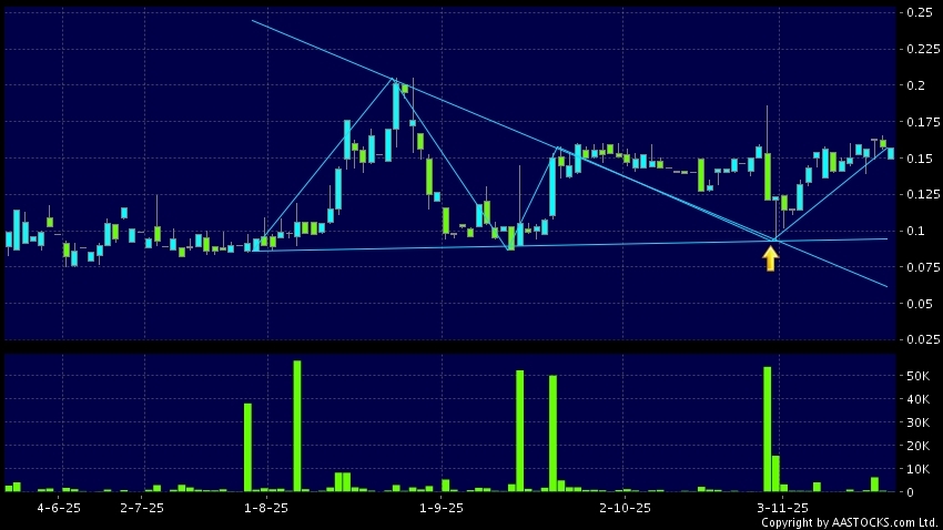 熒德控股(08535.HK) -0.004 (-2.469%) 呈現三角形向上突破。現價報0.157,下跌0.633%,成交量26.00萬股,成交額4.03萬。