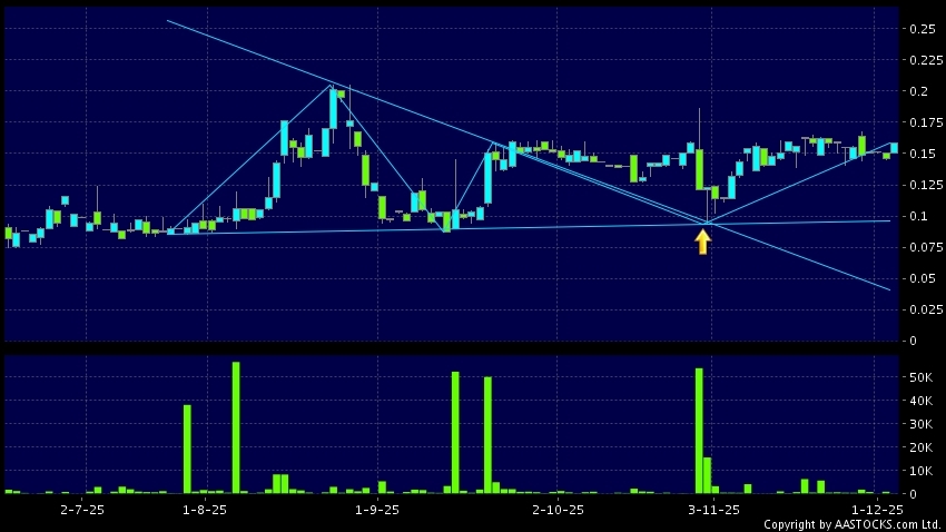 三角形向上突破是指股價的波幅漸漸收窄,在圖表上形成三角形般的狀態。股價在三角形的末端向上突破,形成上升趨勢,技術走勢向好。(港股報價延遲最少十五分鐘。)