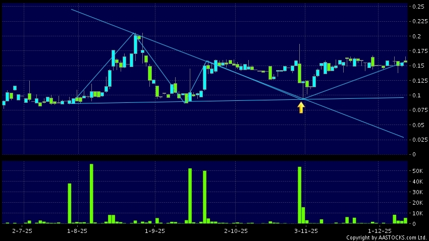 熒德控股(08535.HK) +0.010 (+5.556%) 呈現三角形向上突破。現價報0.156,上升0.645%,成交量5.42百萬股,成交額88.98萬。