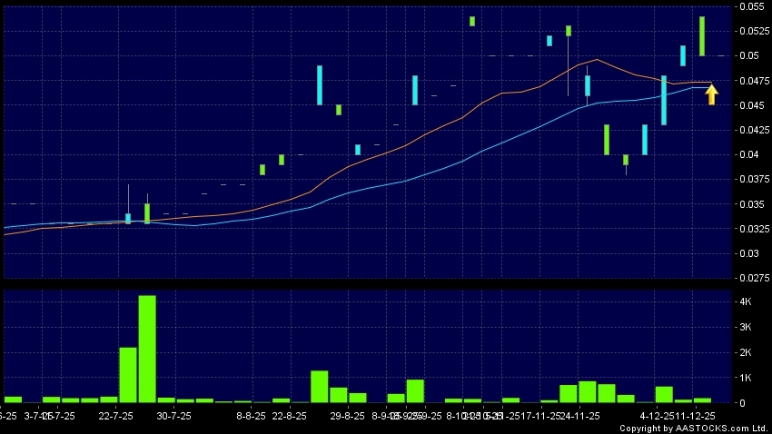 新威工程集團(08616.HK) 0.000 (0.000%) 10天移動平均線升穿20天移動平均線,出現黃金交叉。現價報0.050,無升跌,成交量0.00股,成交額0.00。