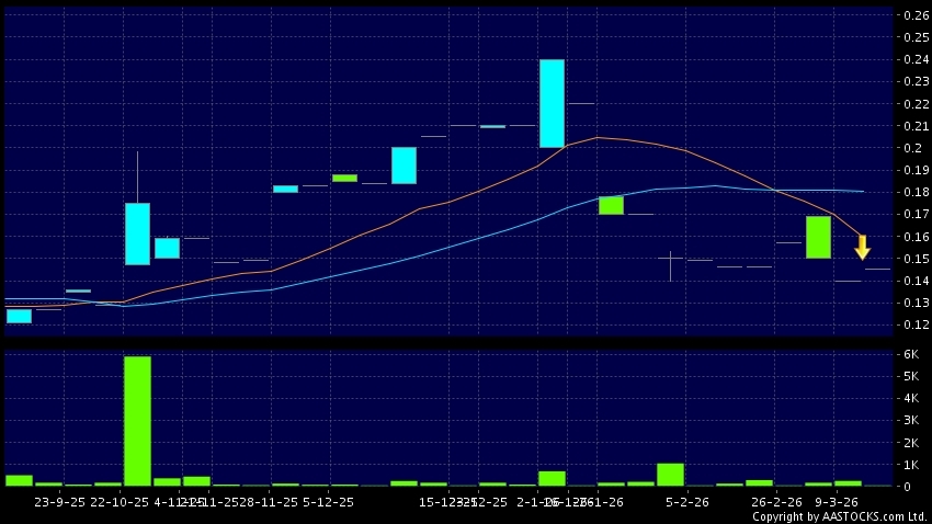 中國蜀塔(08623.HK) -0.009 (-6.383%) 10天移動平均線跌穿20天移動平均線,出現死亡交叉。現價報0.145,上升3.571%,成交量4.00萬股,成交額5.80千。