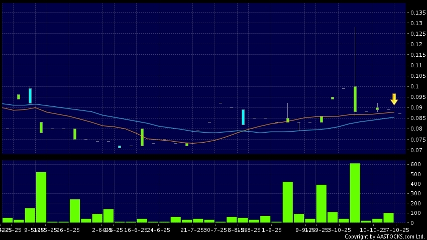 瀛海集團(08668.HK) -0.001 (-1.087%) 10天移動平均線跌穿20天移動平均線,出現死亡交叉。現價報0.087,下跌2.247%,成交量0.00股,成交額0.00。