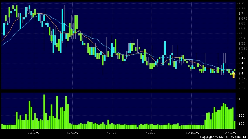 智勤控股(09913.HK) +0.010 (+0.417%) 10天移動平均線升穿20天移動平均線,出現黃金交叉。現價報2.410,無升跌,成交量13.20萬股,成交額31.93萬。