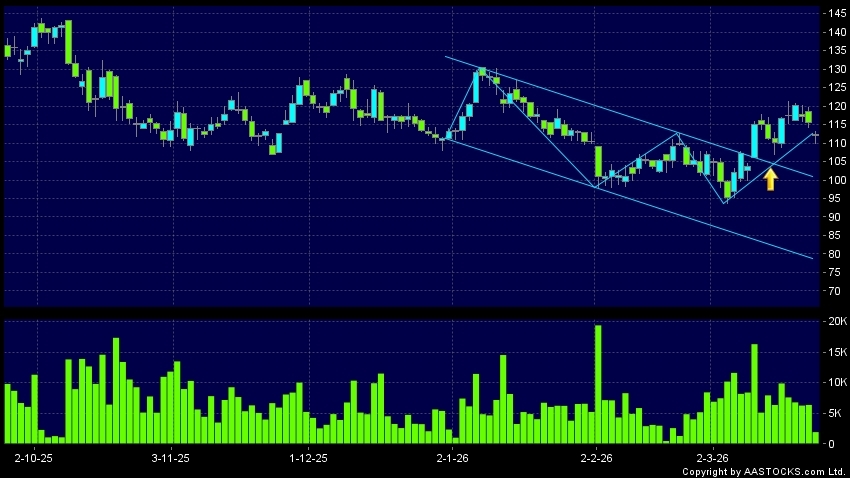 區域突破指股價在過去的一段時間只在一個範圍在內活動,然後股價上升作出突破,升穿區域的頂部,技術走勢向好。(港股報價延遲最少十五分鐘。沽空資料截至 2026-03-24 16:25。)