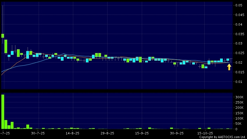 匯景控股(09968.HK)  0.000 (0.000%)   10天移動平均線升穿20天移動平均線,出現黃金交叉。現價報0.022,無升跌,成交量2.38百萬股,成交額5.16萬。