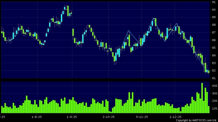 中國移動(00941.HK) -0.400 (-0.487%) 沽空 $1.81億; 比率 16.813% 呈現三重頂突破向下。現價報81.700,下跌0.487%,成交量1.32千萬股,成交額10.78億。