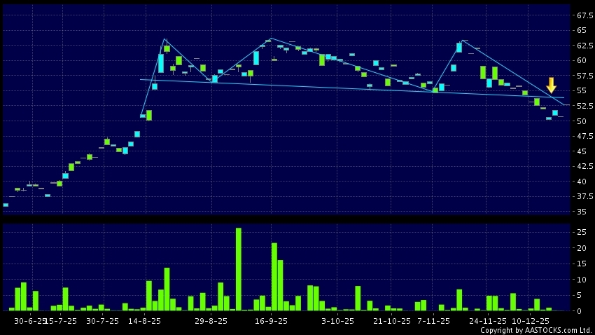頭肩頂是典型的沽出訊號,當股價跌穿支持線(頸線)時,跌勢確認股價將持續下跌,技術走勢偏軟。(港股報價延遲最少十五分鐘。沽空資料截至 2025-12-31 12:25。)