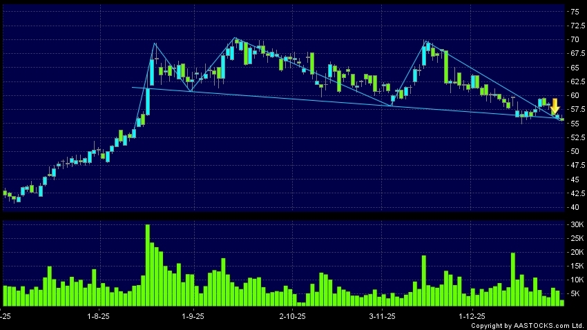 京東健康(06618.HK) -1.000 (-1.770%) 沽空 $1.37千萬; 比率 8.832% 呈現頭肩頂向下突破。現價報55.500,下跌1.770%,成交量2.79百萬股,成交額1.55億。