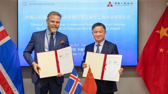 人行行長潘功勝在出席國際貨幣基金組織/世界銀行年會期間,與冰島中央銀行行長約翰松續簽雙邊本幣互換協議,旨在加強雙邊金融合作,便利兩國經貿往來,共同維護金融穩定。中冰雙邊本幣互換協議互換規模為35億元人民幣/700億冰島克朗,協議有效期五年。潘功勝表示,中冰兩國長期保持友好合作關係,冀以續簽雙邊本幣互換為契機,深化雙邊金融合作。(jl/da)相關內容《大行報告》野村下調百勝中國(09987.HK)目標價至454.5元 評級「買入」