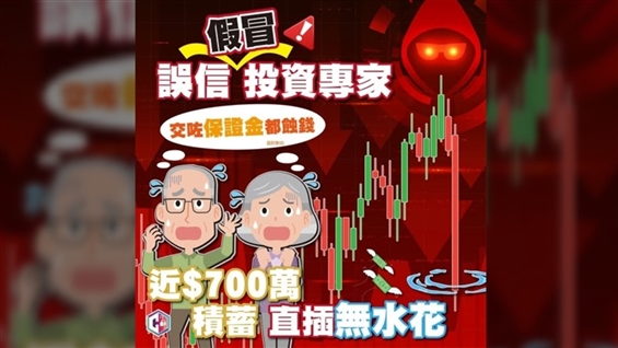 警方「守網者」社交平台公布,過去一周,警方共接獲逾100宗投資騙案,總損失金額逾7,000萬港元。一名八十多歲老友記於半年前收到自稱「投資專家」的白撞WhatsApp,之後一直有討論投資心得,直至近日該「投資專家」訛稱有內幕投資消息,指一隻香港股票即將大幅上漲,誘騙受害人即時買入。擁有多年投資股票經驗的受害人,使用自己的投資平台證券帳戶,買入逾400萬元等值的股份。不料該股在一天內「股價直插」逾八成,受害人隨即賣出,損失逾300萬港元。其後,受害人向騙徒求助,騙徒訛稱可協助追回損失,並建議轉購另一隻「基金」,但須先繳付「保證金」。受害人未有起疑,按指示向騙徒提供的多個個人銀行戶口轉賬逾300萬元。直至事主耗盡投資戶口全部存款,騙徒失去聯絡,才驚覺受騙。受害人共損失近700萬港元。 警方提醒市民:(1)切勿理會來歷不明的白撞訊息;(2)切勿輕信網上「高回報」投資廣告;(3)切勿胡亂轉賬至不明個人銀行戶口;(4)使用「防騙視伏器」或「防騙視伏App」評估詐騙風險。(da/u)