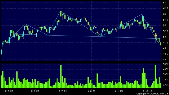 小米集團-W(01810.HK) -0.120 (-0.258%) 沽空 $9.18億; 比率 16.368% 呈現頭肩頂向下突破。現價報46.200,下跌3.145%,成交量1.40億股,成交額65.71億。最近表現:3日 -4.977%5日 -11.239%10日 -17.204%最近成交統計:上日成交量: 2.49億股過去5 天平均成交量: 2.49億股技術分析解說:頭肩頂是典型的沽出訊號,當股價跌穿支持線(頸線)時,跌勢確認股價將持續下跌,技術走勢偏軟。(港股報價延遲最少十五分鐘。沽空資料截至 2025-10-22 16:25。)相關內容查看更多技術走勢偏軟的股票 >免責聲明:以上金融市場數據、報價、圖表 及/或各種技術分析指標乃根據公開資料分析和演釋自動生成的,僅作參考使用。此類自動生成的內容並不代表AASTOCKS.com Limited的立場。AASTOCKS.com Limited並不保證其準確性、完整性、實時性或者正確性。閣下應諮詢獨立專業意見,以核實定價資料或獲取更詳細的市場信息及須為所有跟隨此類自動生成的內容執行的交易或使用該內容負責。