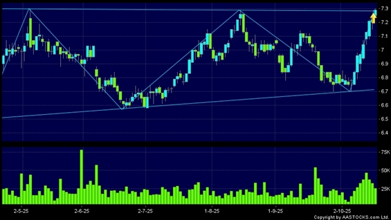 香港中華煤氣(00003.HK) +0.060 (+0.826%) 沽空 $6.99千萬; 比率 30.077% 呈現三角形向上突破。現價報7.290,上升0.970%,成交量2.62千萬股,成交額1.90億。最近表現:3日 +2.244%5日 +4.591%10日 +7.522%最近成交統計:上日成交量: 3.26千萬股過去5 天平均成交量: 3.74千萬股技術分析解說:三角形向上突破是指股價的波幅漸漸收窄,在圖表上形成三角形般的狀態。股價在三角形的末端向上突破,形成上升趨勢,技術走勢向好。(港股報價延遲最少十五分鐘。沽空資料截至 2025-10-28 16:25。)相關內容查看更多技術走勢向好的股票 >免責聲明:以上金融市場數據、報價、圖表 及/或各種技術分析指標乃根據公開資料分析和演釋自動生成的,僅作參考使用。此類自動生成的內容並不代表AASTOCKS.com Limited的立場。AASTOCKS.com Limited並不保證其準確性、完整性、實時性或者正確性。閣下應諮詢獨立專業意見,以核實定價資料或獲取更詳細的市場信息及須為所有跟隨此類自動生成的內容執行的交易或使用該內容負責。