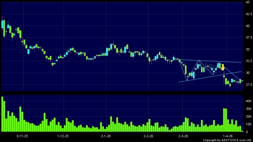 Triangle Breakout means the volatility of price movement is decreasing, stock price finally broke the bottom of triangle. A downward trend will start.(HK stocks quote is delayed for at least 15 mins.Short Selling Data as at 2026-04-17 16:25.)
