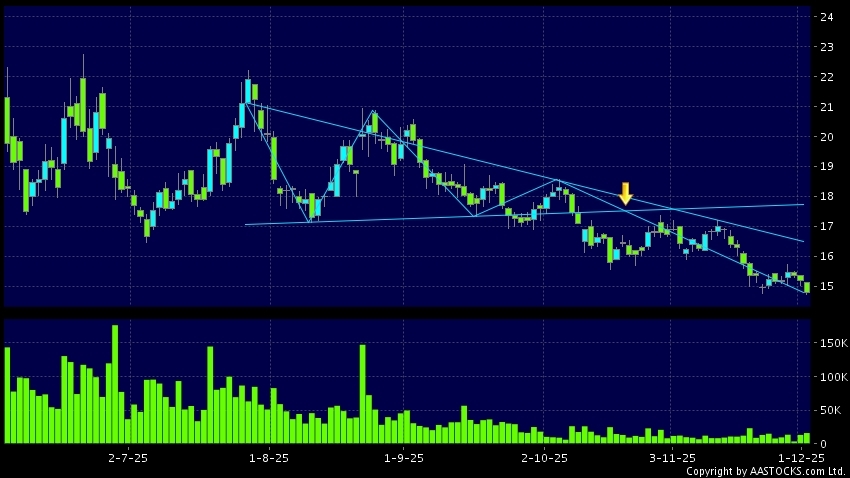 Triangle Breakout means the volatility of price movement is decreasing, stock price finally broke the bottom of triangle. A downward trend will start.(HK stocks quote is delayed for at least 15 mins.Short Selling Data as at 2025-12-05 16:25.)