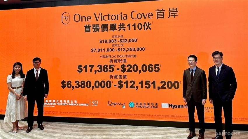 由恒地(00012.HK) -0.340 (-1.118%) 沽空 $5.35千万; 比率 38.908% 、希慎兴业(00014.HK) +0.060 (+0.313%) 沽空 $1.31千万; 比率 49.224% 及帝国集团携手打造的红磡新核心大型海滨住宅项目首岸(One Victoria Cove)第1期(第2座)今日(14日)公布首张价单,首批涉及110伙,户型涵盖两房至三房,当中包括100伙两房单位及10伙三房一套单位,折实售价由638万至1,215.12万元,折实尺价由17,365至20,065元。