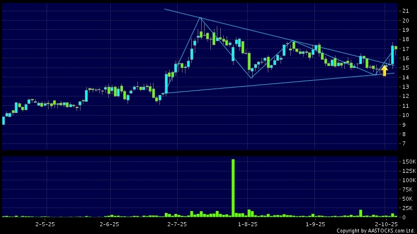 三角形向上突破是指股价的波幅渐渐收窄,在图表上形成三角形般的状态。股价在三角形的末端向上突破,形成上升趋势,技术走势向好。(港股报价延迟最少十五分钟。沽空资料截至 2025-10-10 16:25。)
