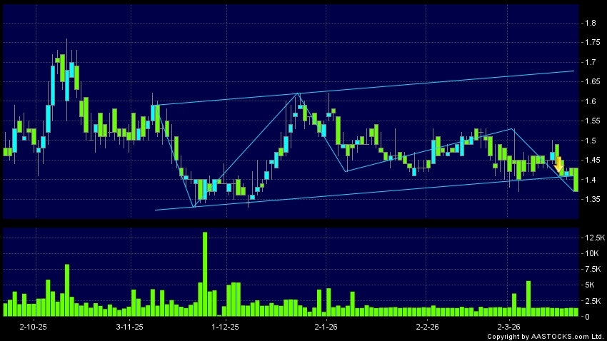区域突破指股价在过去的一段时间只在一个范围在内活动,然後股价下跌作出突破,跌穿区域的底部,技术走势偏软。(港股报价延迟最少十五分钟。沽空资料截至 2026-04-02 16:25。)