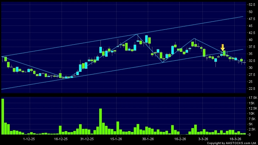 区域突破指股价在过去的一段时间只在一个范围在内活动,然後股价下跌作出突破,跌穿区域的底部,技术走势偏软。(港股报价延迟最少十五分钟。沽空资料截至 2026-04-01 16:25。)
