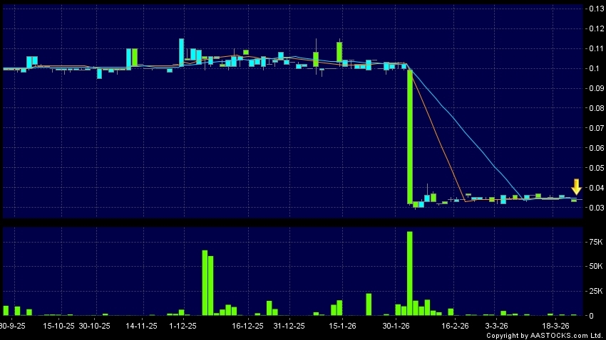声扬集团(08163.HK) 0.000 (0.000%) 10天移动平均线跌穿20天移动平均线,出现死亡交叉。现价报0.033,无升跌,成交量0.00股,成交额0.00。