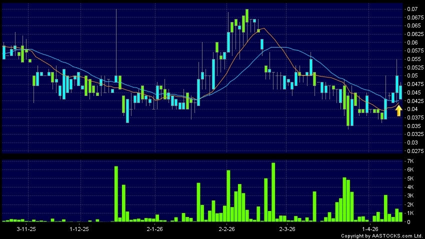 百信國際(00574.HK) +0.002 (+4.000%) 10天移動平均線升穿20天移動平均線,出現黃金交叉。現價報0.047,下跌6.000%,成交量1.11百萬股,成交額5.08萬。