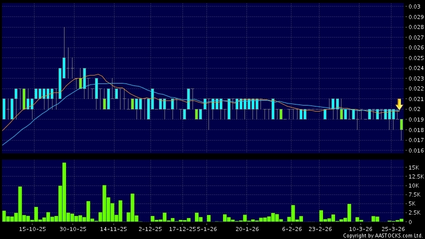 綜合環保集團(00923.HK) 0.000 (0.000%) 10天移動平均線跌穿20天移動平均線,出現死亡交叉。現價報0.018,下跌5.263%,成交量81.60萬股,成交額1.46萬。