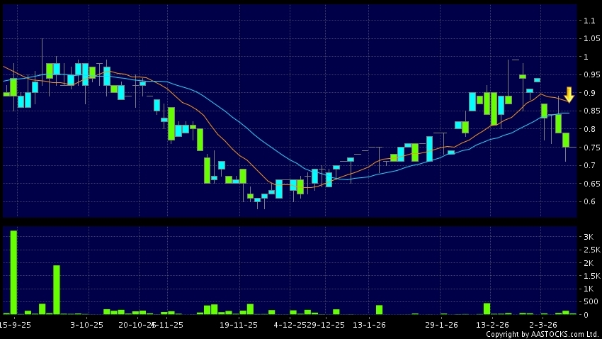 偉志控股(01305.HK) -0.040 (-5.479%) 10天移動平均線跌穿20天移動平均線,出現死亡交叉。現價報0.750,無升跌,成交量4.60萬股,成交額3.45萬。