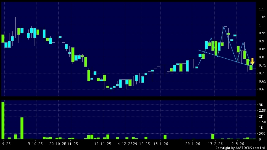 偉志控股(01305.HK) -0.040 (-5.479%) 呈現頭肩頂向下突破。現價報0.730,上升1.389%,成交量5.00萬股,成交額3.65萬。
