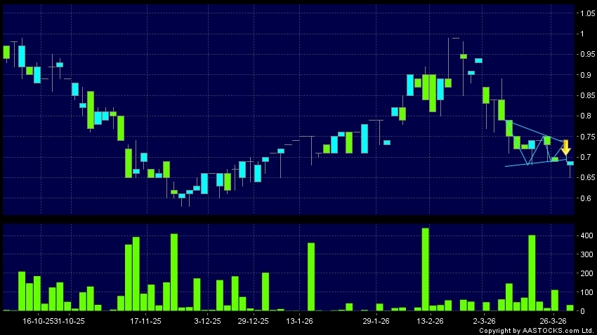 偉志控股(01305.HK) -0.040 (-5.479%) 呈現三角形向下突破。現價報0.690,下跌5.479%,成交量3.20萬股,成交額2.17萬。