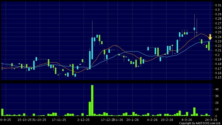 進昇集團控股(01581.HK) +0.030 (+10.345%) 10天移動平均線跌穿20天移動平均線,出現死亡交叉。現價報0.210,無升跌,成交量0.00股,成交額0.00。