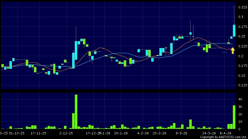 進昇集團控股(01581.HK) +0.030 (+10.345%) 10天移動平均線升穿20天移動平均線,出現黃金交叉。現價報0.290,上升16.000%,成交量3.26百萬股,成交額97.67萬。