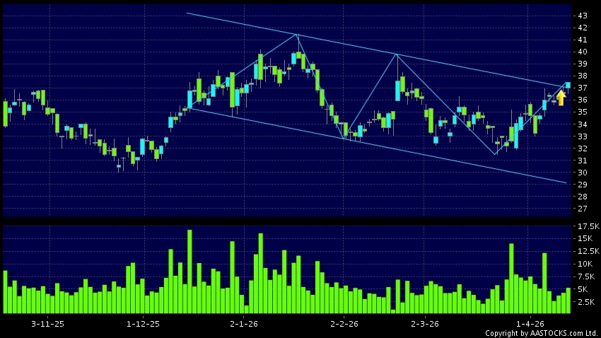 區域突破指股價在過去的一段時間只在一個範圍在內活動,然後股價上升作出突破,升穿區域的頂部,技術走勢向好。(港股報價延遲最少十五分鐘。沽空資料截至 2026-04-21 16:25。)