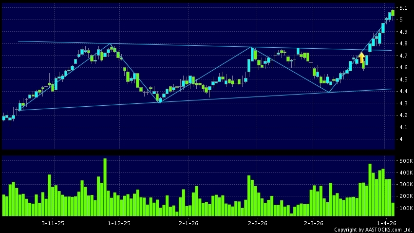 三角形向上突破是指股價的波幅漸漸收窄,在圖表上形成三角形般的狀態。股價在三角形的末端向上突破,形成上升趨勢,技術走勢向好。(港股報價延遲最少十五分鐘。沽空資料截至 2026-04-10 16:25。)