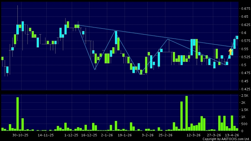 環宇物流(亞洲)(06083.HK) +0.010 (+1.667%) 呈現頭肩底向上突破,股價升穿頸線。現價報0.580,無升跌,成交量25.60萬股,成交額14.80萬。