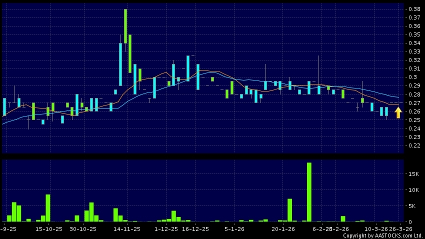 環球戰略集團(08007.HK) -0.060 (-10.526%) 10天移動平均線升穿20天移動平均線,出現黃金交叉。現價報0.270,無升跌,成交量0.00股,成交額0.00。