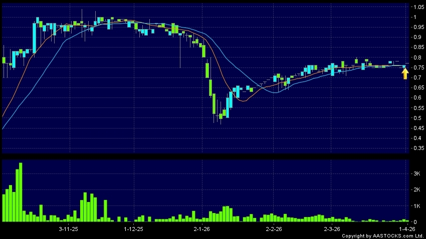 匯思太平洋(08147.HK) +0.010 (+1.316%) 10天移動平均線升穿20天移動平均線,出現黃金交叉。現價報0.770,上升1.316%,成交量10.40萬股,成交額8.01萬。