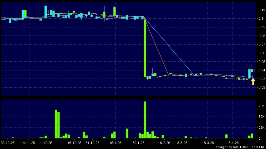 聲揚集團(08163.HK) -0.002 (-5.405%) 10天移動平均線升穿20天移動平均線,出現黃金交叉。現價報0.038,無升跌,成交量34.00萬股,成交額1.30萬。