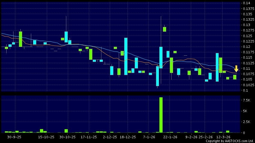 樹熊金融集團(08226.HK) +0.005 (+6.667%) 10天移動平均線跌穿20天移動平均線,出現死亡交叉。現價報0.109,上升2.830%,成交量3.50萬股,成交額3.82千。