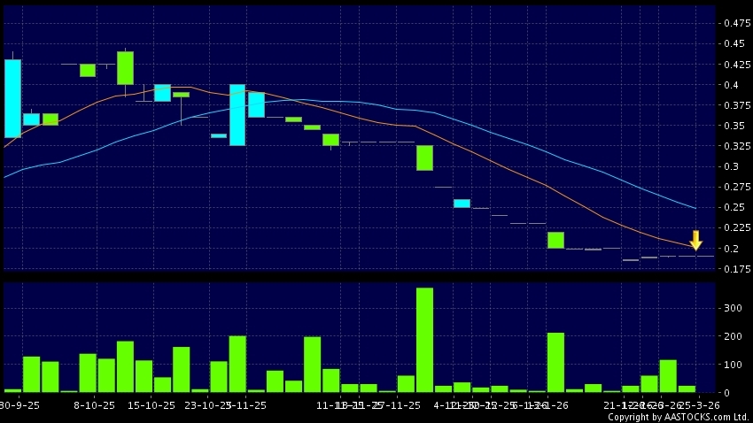 華星控股(08237.HK) -0.025 (-5.051%) 10天移動平均線跌穿20天移動平均線,出現死亡交叉。現價報0.190,無升跌,成交量0.00股,成交額0.00。