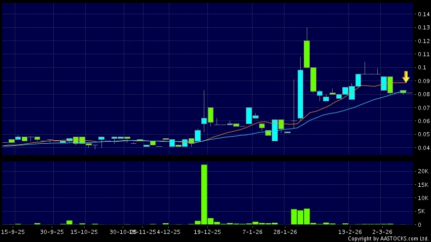 華美樂樂(08429.HK) -0.012 (-15.789%) 10天移動平均線跌穿20天移動平均線,出現死亡交叉。現價報0.081,無升跌,成交量0.00股,成交額0.00。