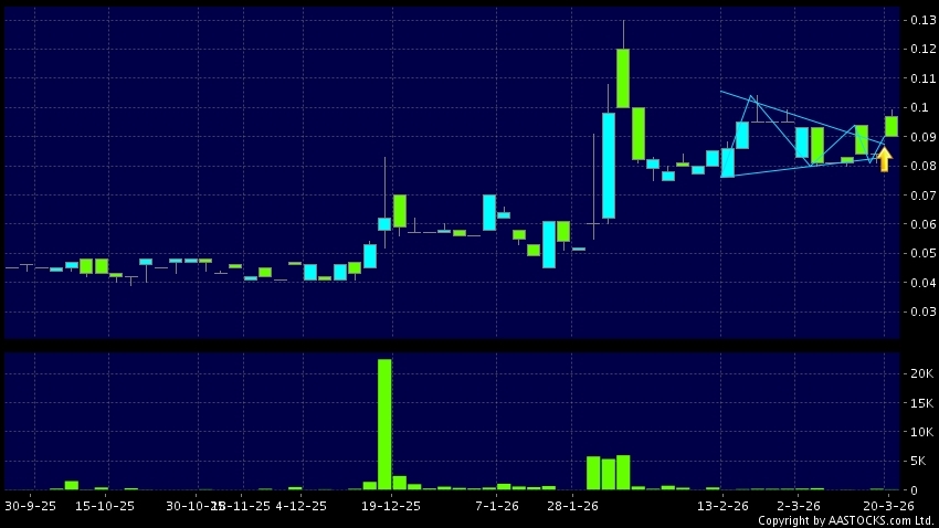 華美樂樂(08429.HK) -0.012 (-15.789%) 呈現三角形向上突破。現價報0.090,上升7.143%,成交量12.00萬股,成交額1.15萬。
