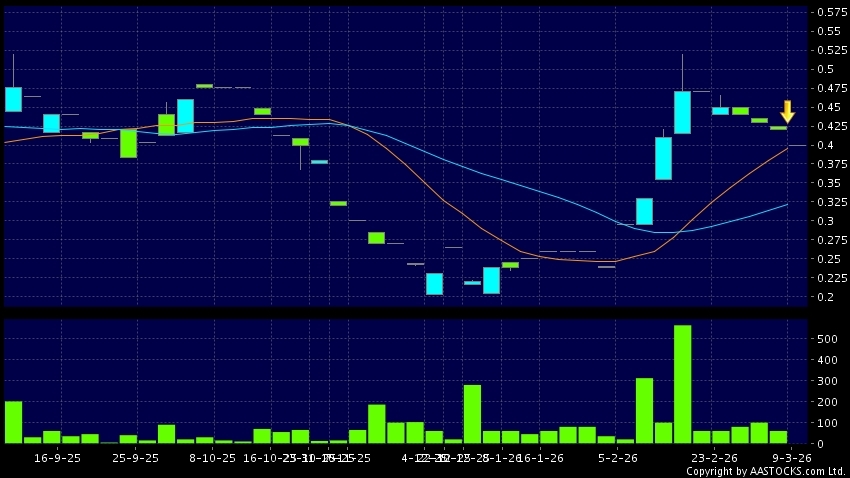 新享時代(08519.HK) -0.005 (-1.818%) 10天移動平均線跌穿20天移動平均線,出現死亡交叉。現價報0.400,下跌2.439%,成交量0.00股,成交額0.00。